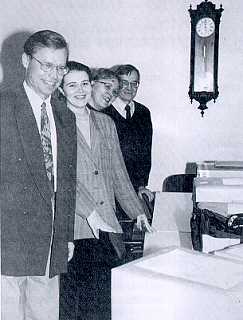 Figure 3. It is two minutes before the deadline for the submission of bids on November 19, 1996. The cheerful Finnra personnel, from left, Risto Pelttari (Project Manager), Maria Rautavirta, Kaisa-Leena V�lipirtti and Seppo Nuolua. They open the bids soon.