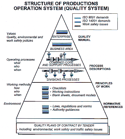 Structurally and conceptually, environmental systems are largely similar to quality systems. At the conceptual revel, both aim at improving activities continually, preventing problems in advance and bringing all activities under control. At Finnra, it is expedient to make the environmental management system a part of the operation system (quality system). This helps to avoid unnecessary bureaucracy and resistance that may rise upon the introduction of two separate systems. An organisation that has implemented principles of quality management finds it easy to adopt the principles of an environmental management system and the systematic ways typical of quality systems. Figure 1 demonstrates the structure of the productions operation system.