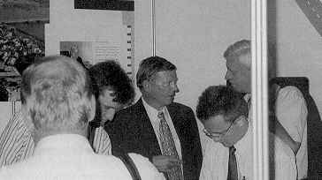 A crowd at the exhibition stand of the Latvian Road Administration. Center of photo and at his left, the Finnish and Latvian Director Generals, Lasse Weckstr�m and Olafs Kronlaks.Via Baltica, the highway linking Finland, Estonia, Latvia, Lithuania and Poland and being under rehabilitation on several road sections was dealt in meny papers of the conference.